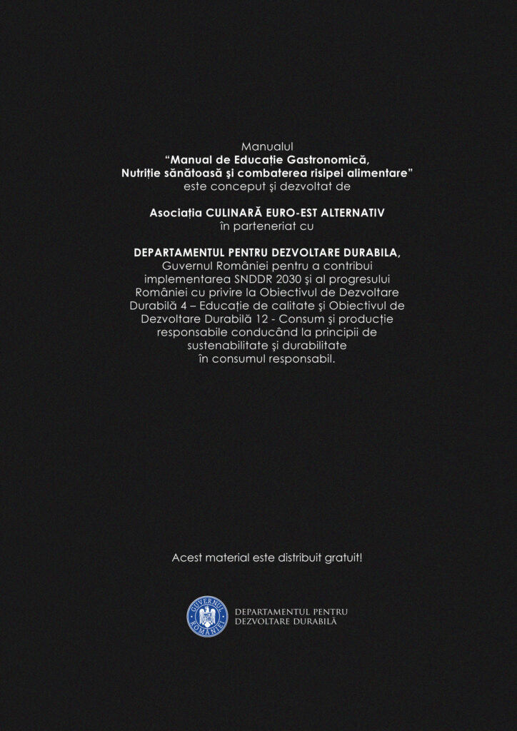 Manualul “Manual de Educație Gastronomică, Nutriție sănătoasă și combaterea risipei alimentare” este conceput și dezvoltat de Asociația CULTURALĂ EURO-EST ALTERNATIV în parteneriat cu DEPARTAMENTUL PENTRU DEZVOLTARE DURABILĂ, Guvernul României pentru a contribui la implementarea SNDDR 2030 și al progresului României cu privire la Obiectivul de Dezvoltare Durabilă 4 – Educație de calitate și Obiectivul de Dezvoltare Durabilă 12 – Consum și producție responsabile conducând la principii de sustenabilitate și durabilitate în consumul responsabil.